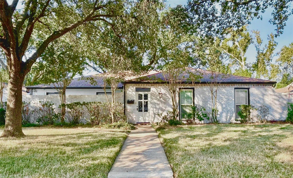 Four bedroom home in Briargrove Park with updated kitchen and bathrooms. Kitchen includes glass front cabinetry and modern finishes. Hardwood floors throughout the main living areas. Primary suite features a renovated bath with walk-in shower and updated fixtures. Additional bedrooms share updated secondary baths. Private courtyard at the front entry provides an outdoor sitting area. Backyard is landscaped with mature trees and greenery, surrounding a pool and spa. Gas light at front entry.