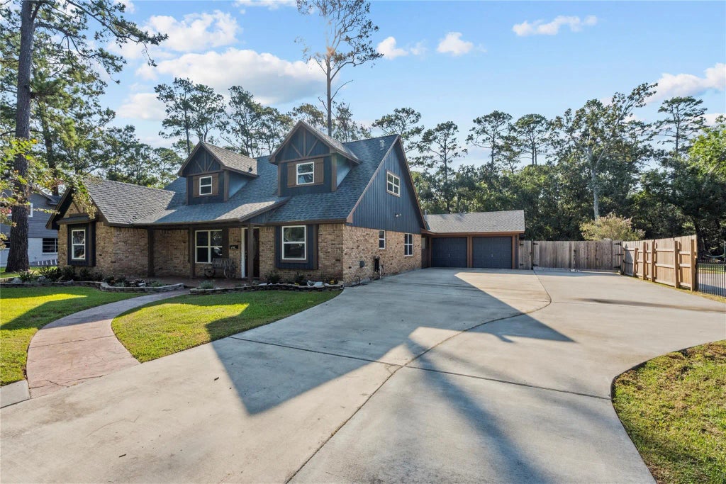 Set on nearly ½ acre with NO HOA and no deed restrictions, this charming property offers room to live, play, and create. A double-wide driveway leads to an oversized 4-car detached garage with workshop—plus side parking for your boat, RV, or projects. Inside, discover a bright, flexible layout perfect for today’s lifestyle. The front bonus room doubles as a home office, media space, or playroom. The first floor features tile throughout, an open-concept living area, a spacious kitchen with generous cabinetry, and a private primary suite. Upstairs, enjoy three large bedrooms with rich wood flooring and natural light. With ample closets, built-ins, and hidden storage, everything has a place. Step outside to a covered patio with stamped concrete, overlooking a fenced backyard made for entertaining, relaxing, or weekend barbecues. All in a peaceful neighborhood with quick access to I-45, Hwy 146, schools, shopping, and dining—just 30 minutes from Houston or Galveston!